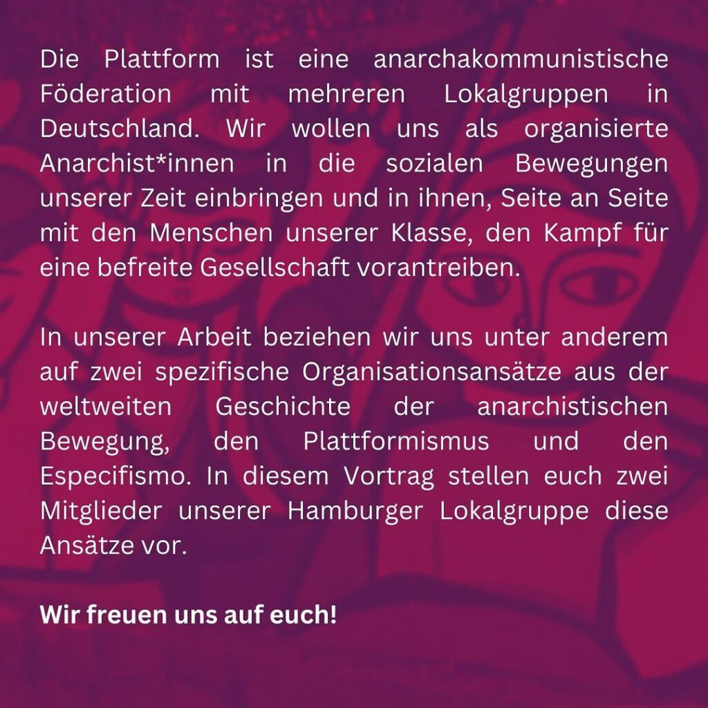 In unserer Arbeit als Plattform beziehen wir uns unter anderem auf zwei spezifische Organisationsansätze aus der weltweiten Geschichte der anarchistischen Bewegung, den Plattformismus und den Especifismo. In diesem Vortrag stellen euch zwei Mitglieder unserer Hamburger Lokalgruppe diese Ansätze vor.