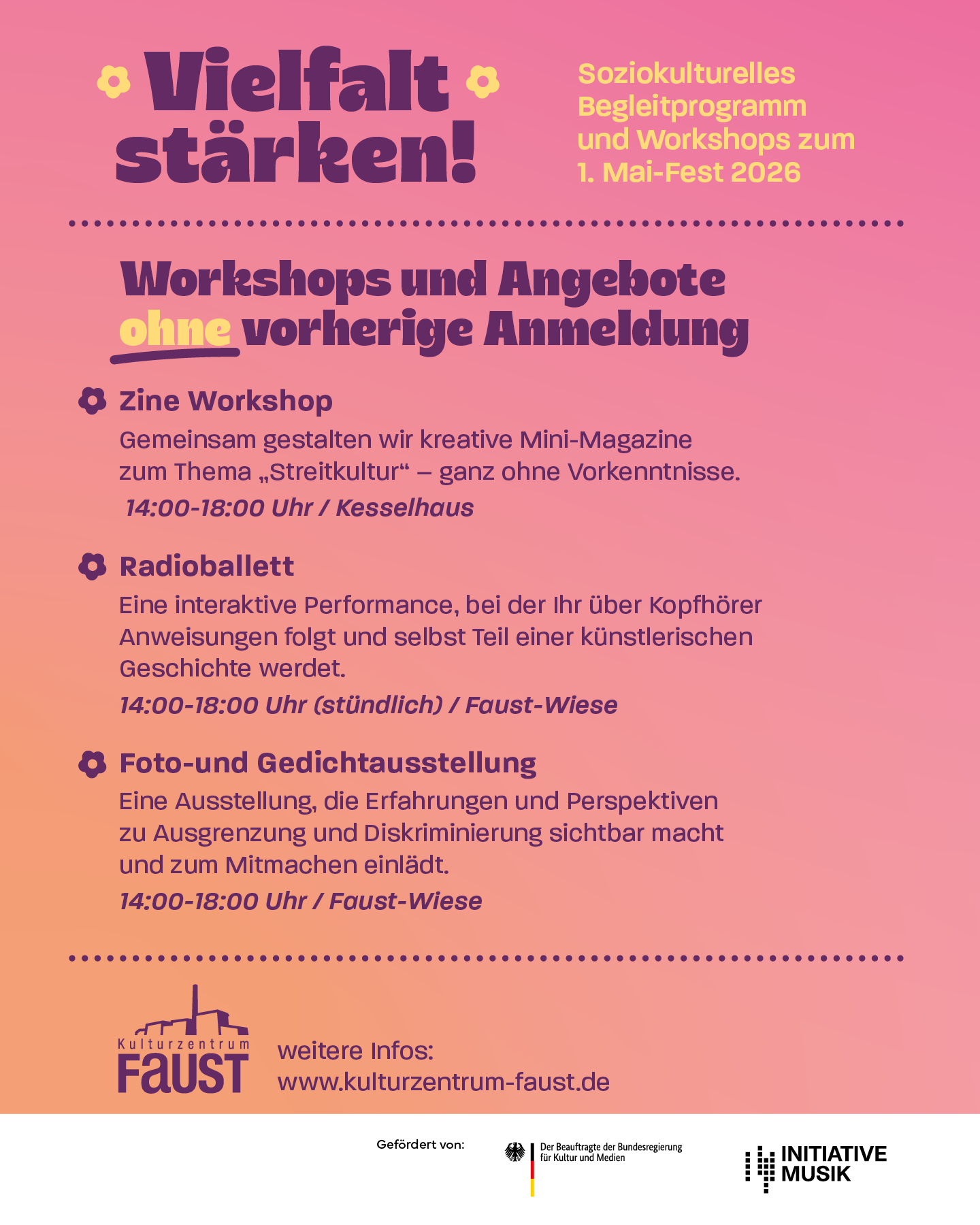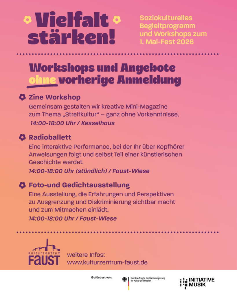 Unter dem programmatischen Motto “Vielfalt stärken!” bietet das Kulturzentrum Faust zum Internationalen 1. Mai-Fest indoor und outdoor ein umfangreiches Angebot.